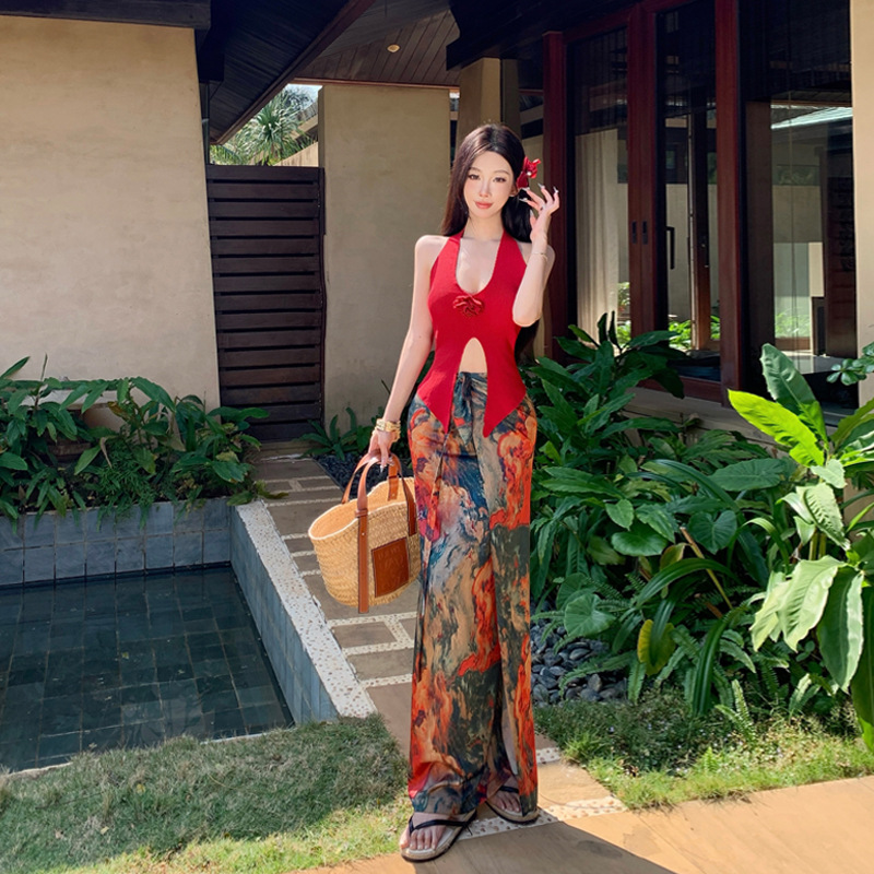 2025フランスリゾート風油絵プリントサテンスカートワンピース