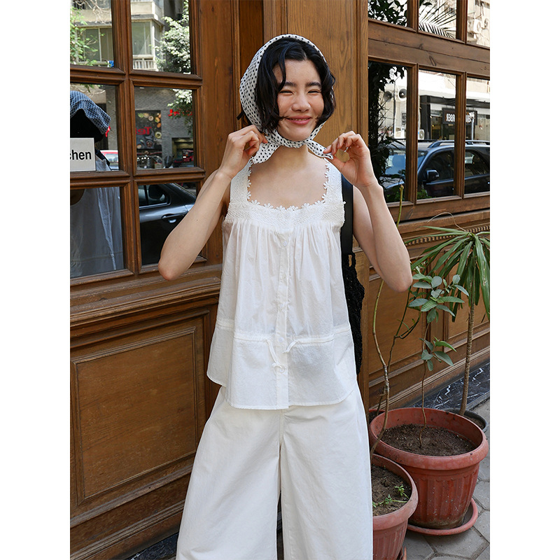【ファンの福利厚生】前後スクエアネックレースシャツ、軽くて通気性の良いウエストタイアップトップス トレンド 01112