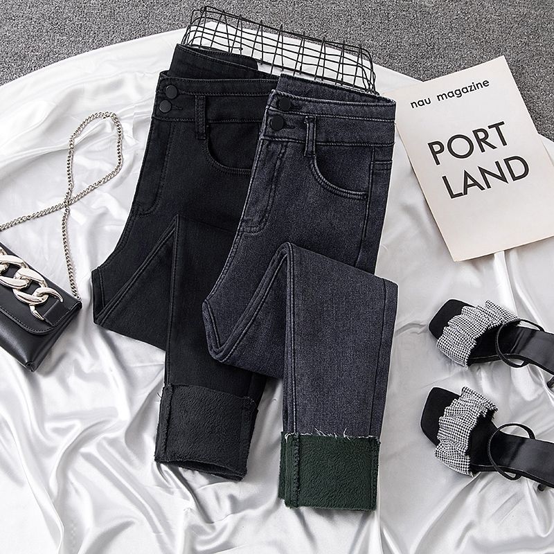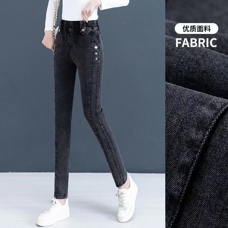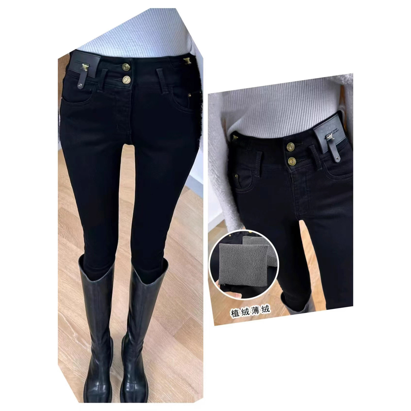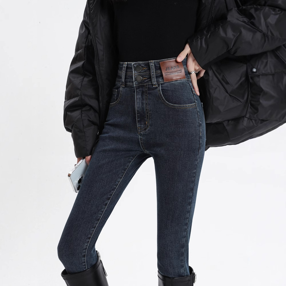 ベルベットの厚いジーンズの女性2024年の新しい秋冬のボタンの腰が高くてやせている足の鉛筆のズボン