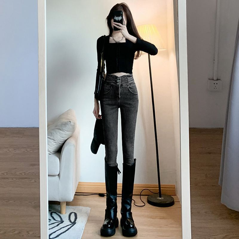 高腰の黒い灰色のジーパンの女性の秋冬の2022年の新型の弾力性の黒色はやせている鉛筆の小さい足のズボンを現します。