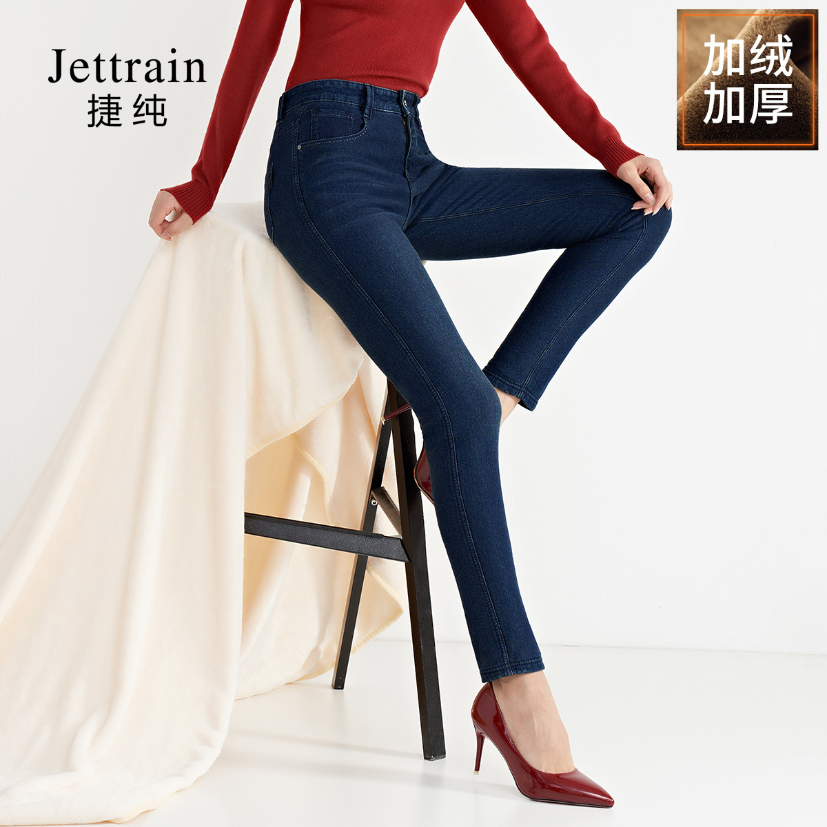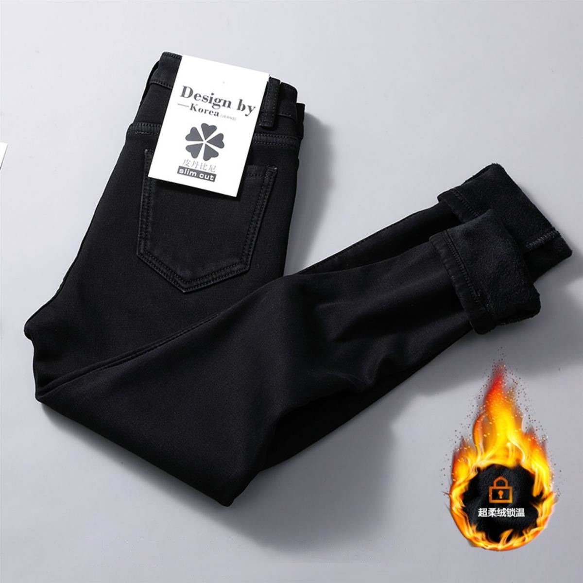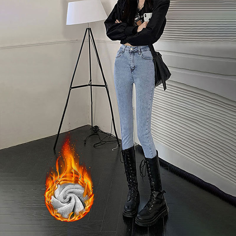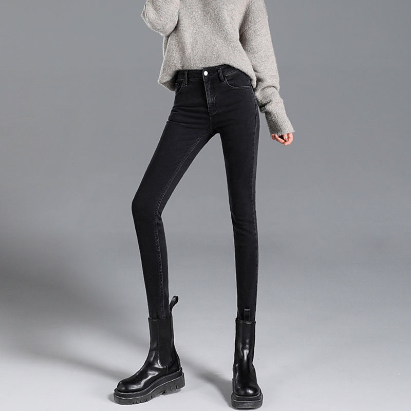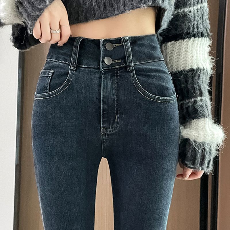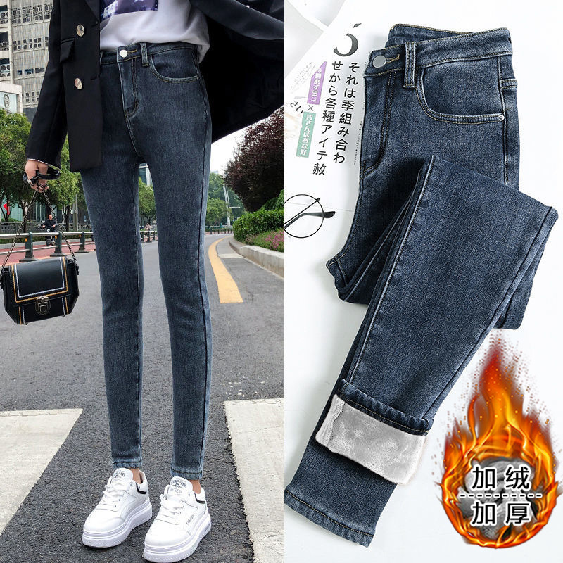 捷純冬にベルベットを厚くして腰の高い四面の弾力性を身につけて痩せているように見える足の鉛筆を着てジーンズを温める女性