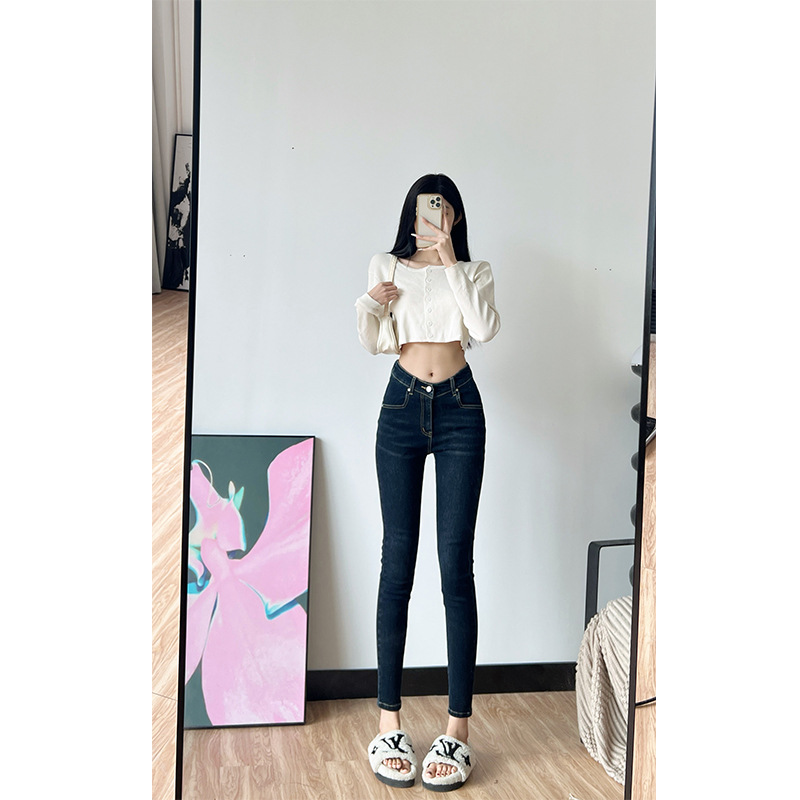 ベルベットはジーンズの女性のガードルを厚くして腰が高い2023年秋にやせた弾力性のある鉛筆のズボンを身に着けた