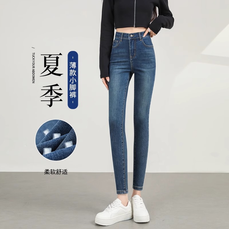 足の小さいジーパンの女性の2025新型の夏の薄い金の紺色の小さい背の復古の高い腰はやせているスリムな鉛筆のズボンを現します。
