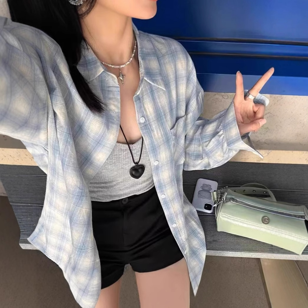 水色の格子の日焼け止めのシャツの女性の夏の薄いタイプの韓国版のゆったりしていて怠惰な風の百合の長袖のシャツの女性のコート