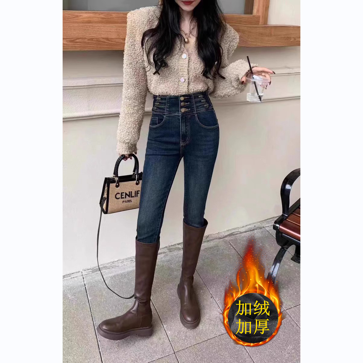 高弾快適徳絨毛とベルベットの厚いズボンの高腰が痩せて見える鉛筆ジーンズ女24冬D1105N