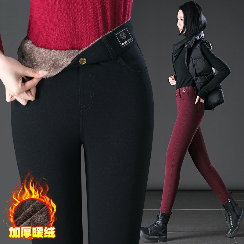 厚い羊の小毛のジーパンの女性の冬のベルベットの新型の大きいサイズのテンションの高い腰のガードルの小さい足の靴のズボンの外で着ます。