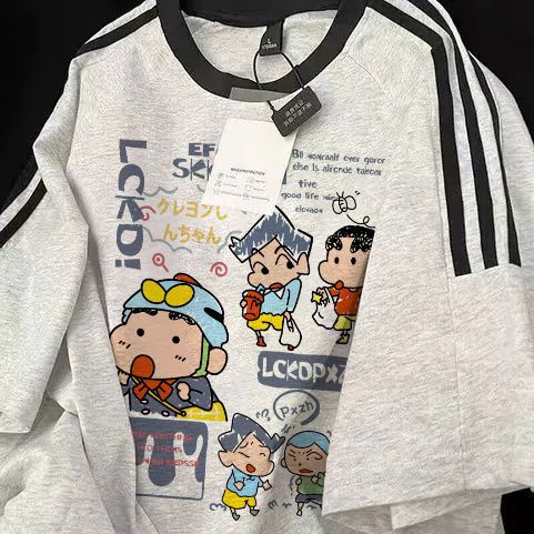 日本のレトロな漫画クレヨンしんちゃんの三本ストライプ半袖Tシャツ、男性と女性用、ゆったりとした怠惰なスタイルの新しい夏のトップス