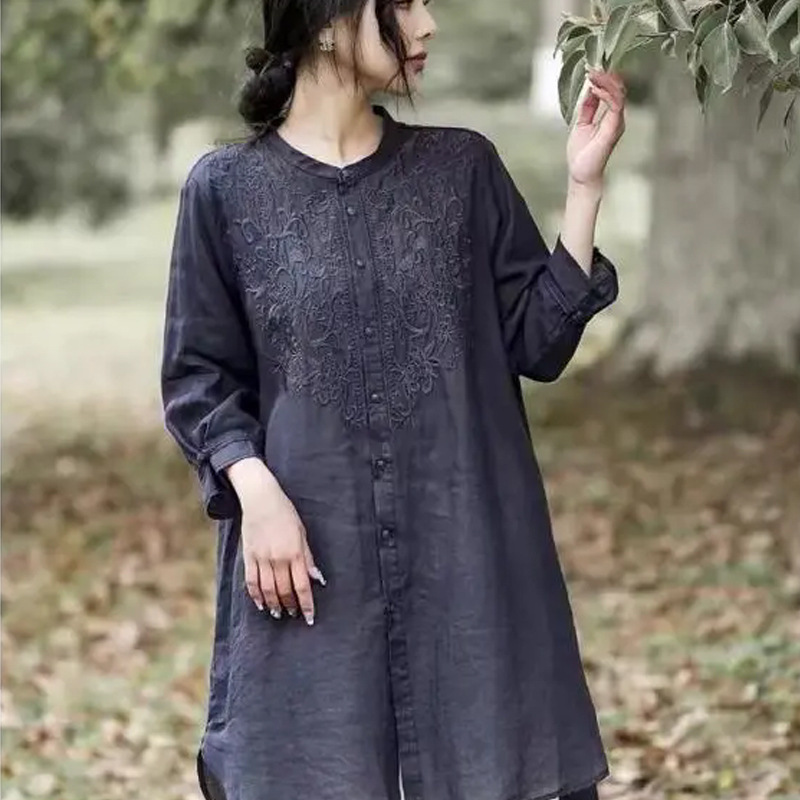 女装復古刺繍綿麻カーディガンの中長タイプ2024夏気質日焼け止め服エアコンシャツカジュアルコート