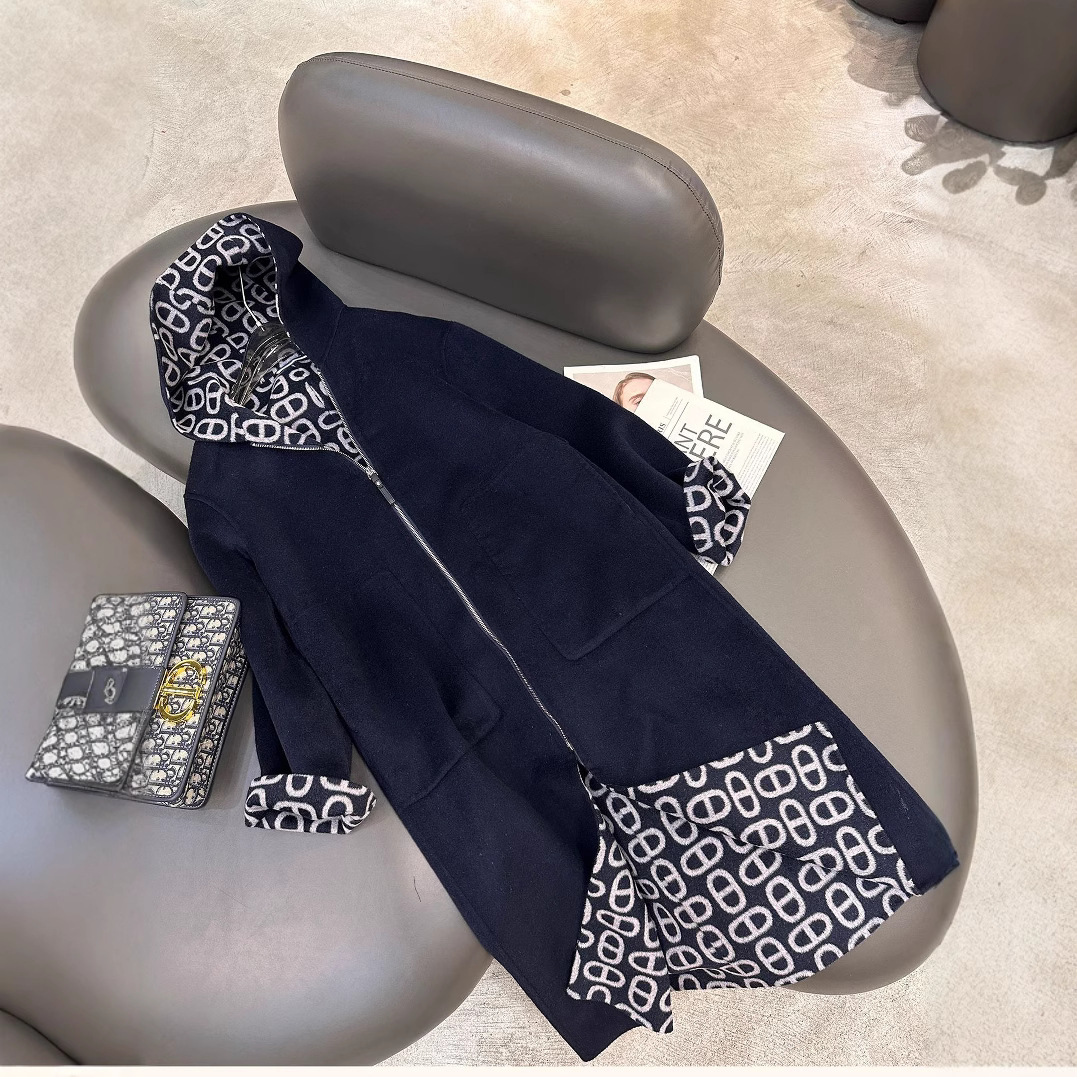 2025秋冬新作両面カシミヤウール老眼ジッパーフード付きウールロングコート女性用