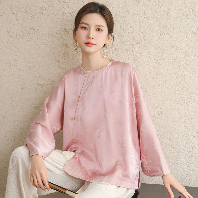 2024夏の新型女装新中国式斜襟ジャカード少女粉上着レトロカジュアルゆるい女性茶服