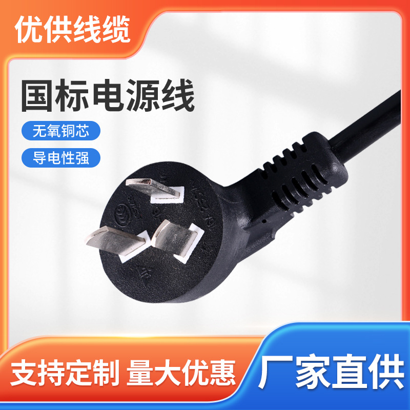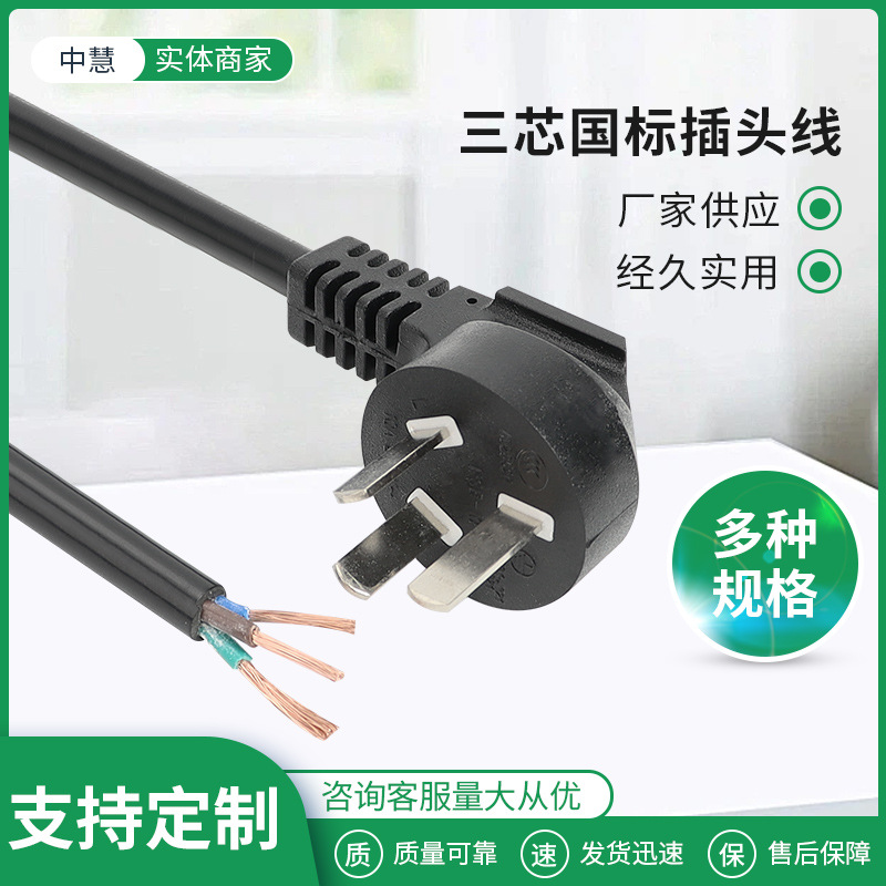 3芯国家標準プラグコード、裸尾線付きエルボプラグ、純銅電源コード、黒、カスタマイズをサポート