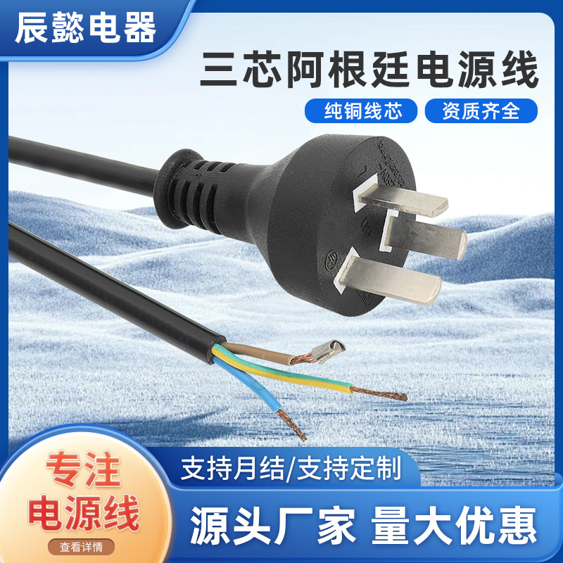 3芯アルゼンチン電源コード ストレートプラグ 裸尾付き 電源コード 黒平プラグ電源コード