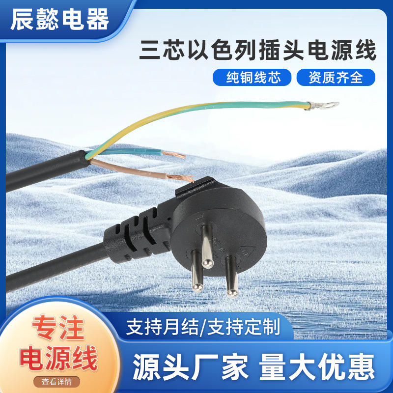 3芯イスラエルプラグ電源コード 90度エルボ丸プラグ電源コード 3プラグイスラエル裸尾線