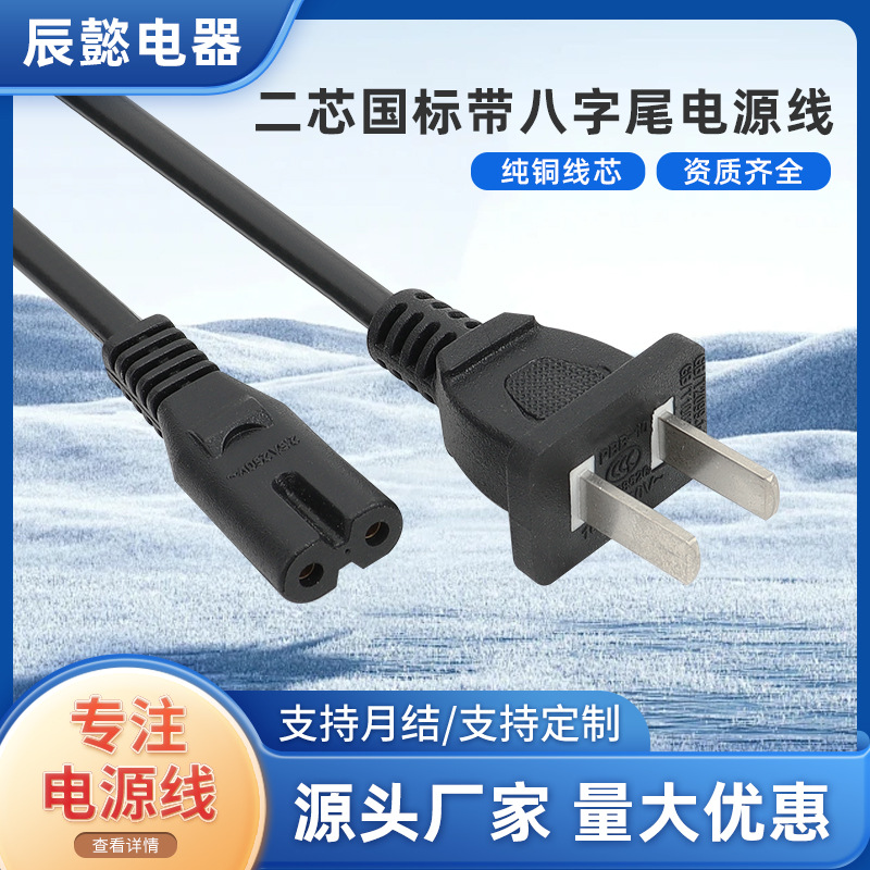 2芯国家標準8字型電源コード、電化製品用電源コード、2プラグ黒電源コード