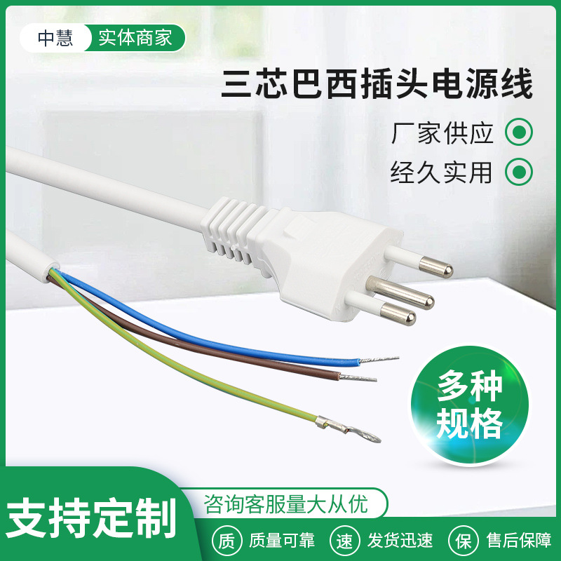 ストレートホワイトネイキッドテールワイヤー 3芯ブラジルプラグ電源コード 3ピン丸プラグブラジル規格純銅プラグワイヤー
