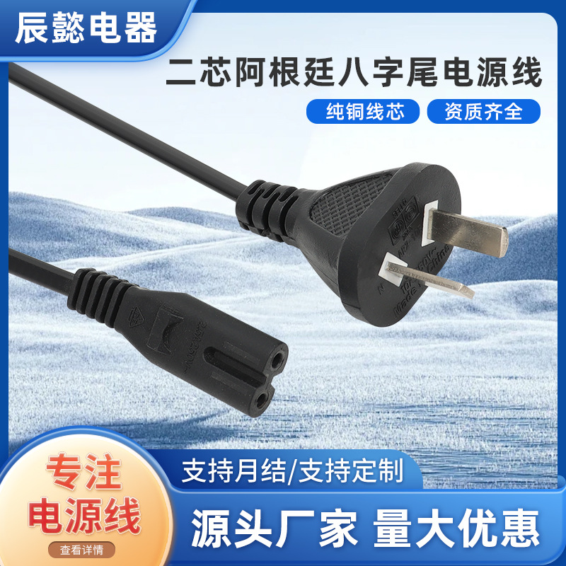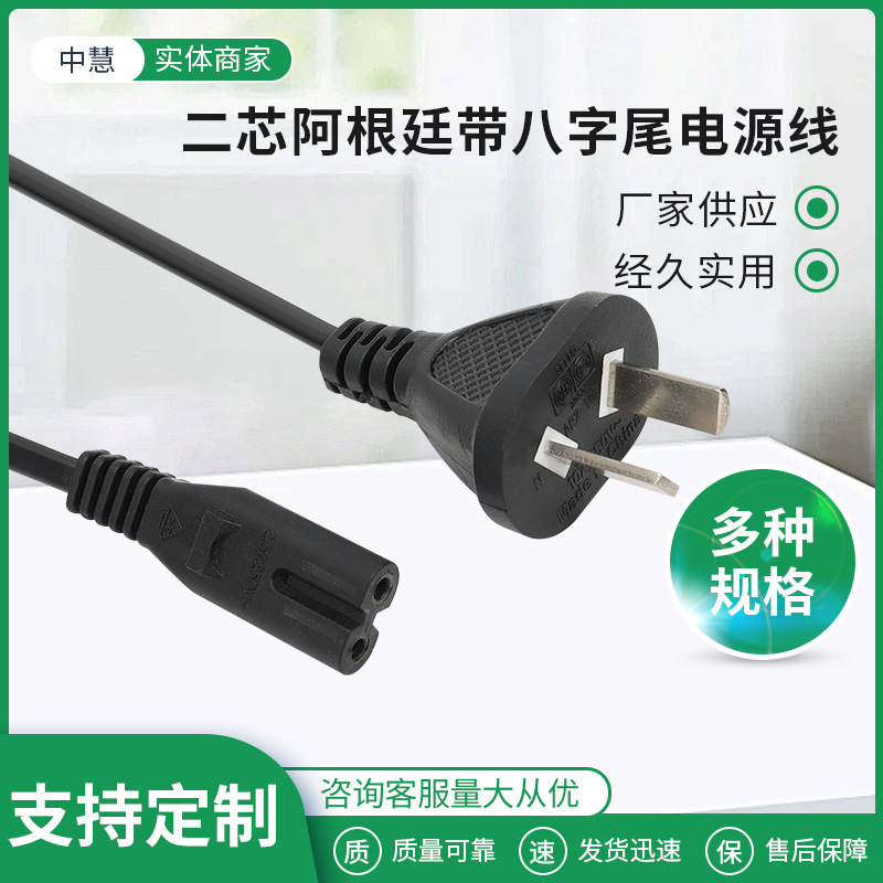 2芯アルゼンチン電源コード、裸尾付き8字プラグ、電源コード、黒平プラグ電源コード