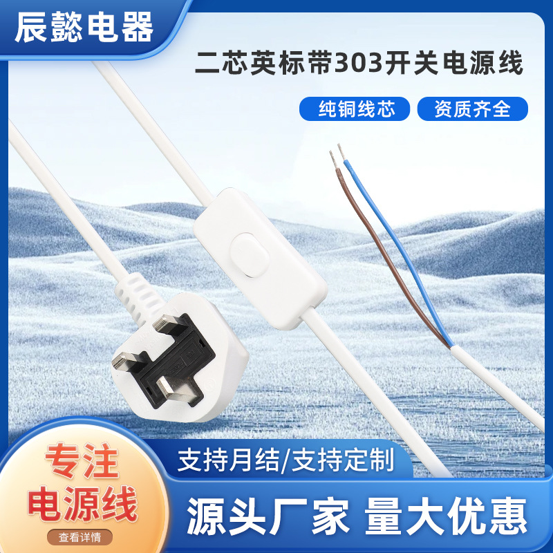 2芯英国規格303スイッチ電源コード付き英国プラグコード3プラグ白裸尾線