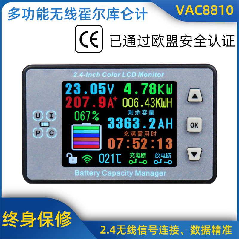 VAC8810 2.4inch カラースクリーンワイヤレス電圧計温度容量電量計バッテリーマネジメントシステム