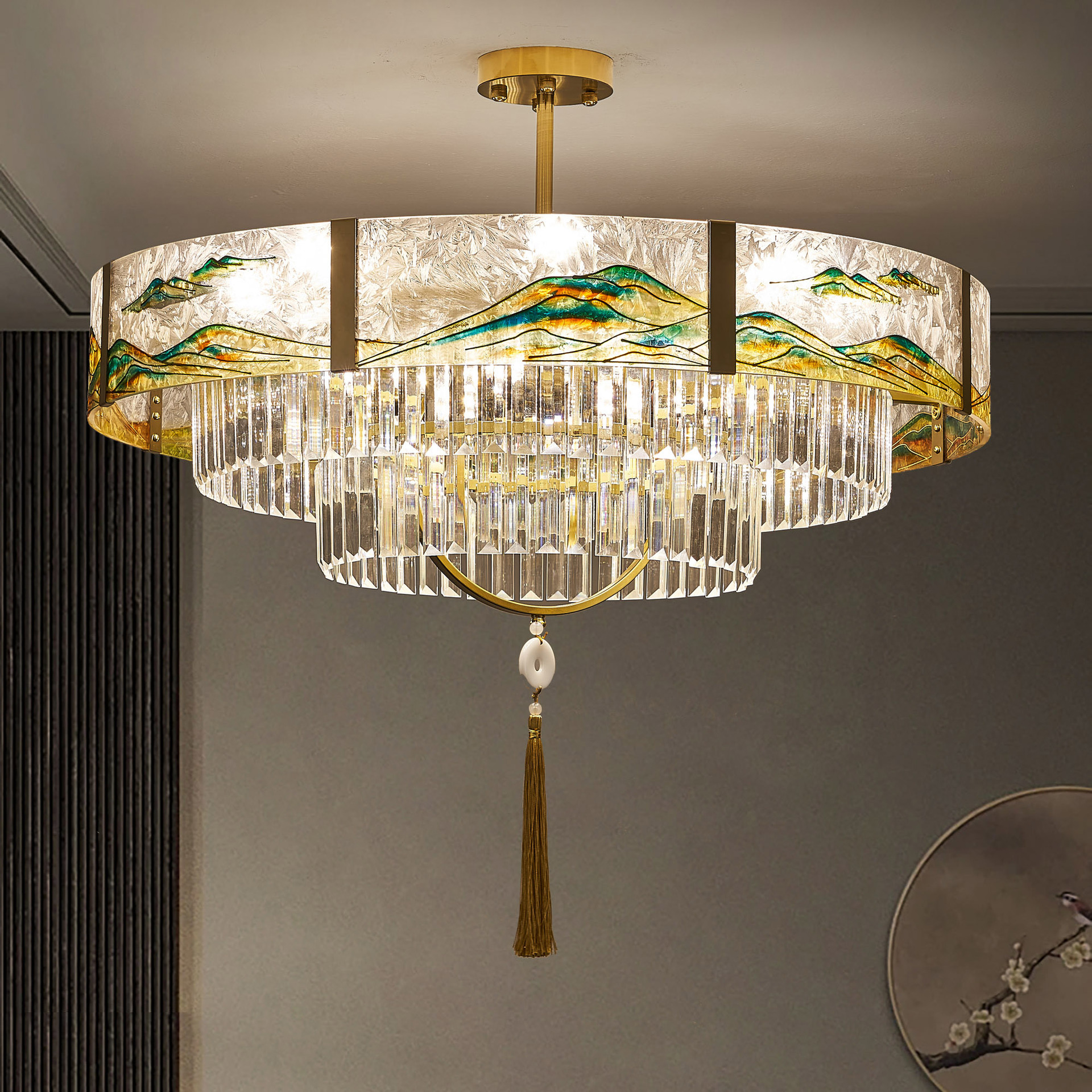 新中国式客間シャンデリア2025新型現代シンプル大気レストラン寝室軽贅沢水晶ガラス照明器具