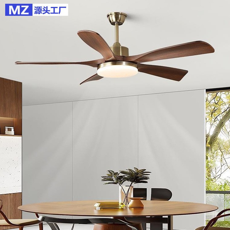 2025年新型ウォールナット材中世風リビングルーム用直葉扇風機、スマートインバーター静音大風量シーリングファンライト