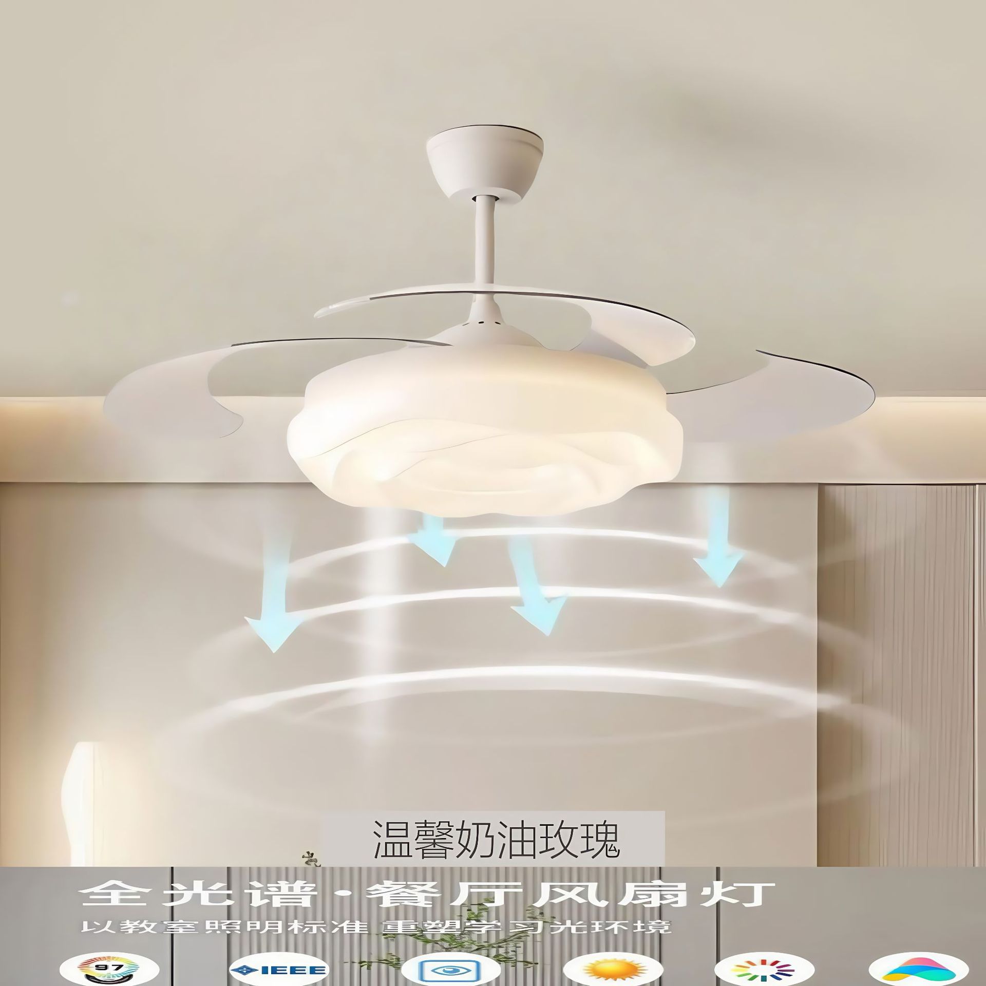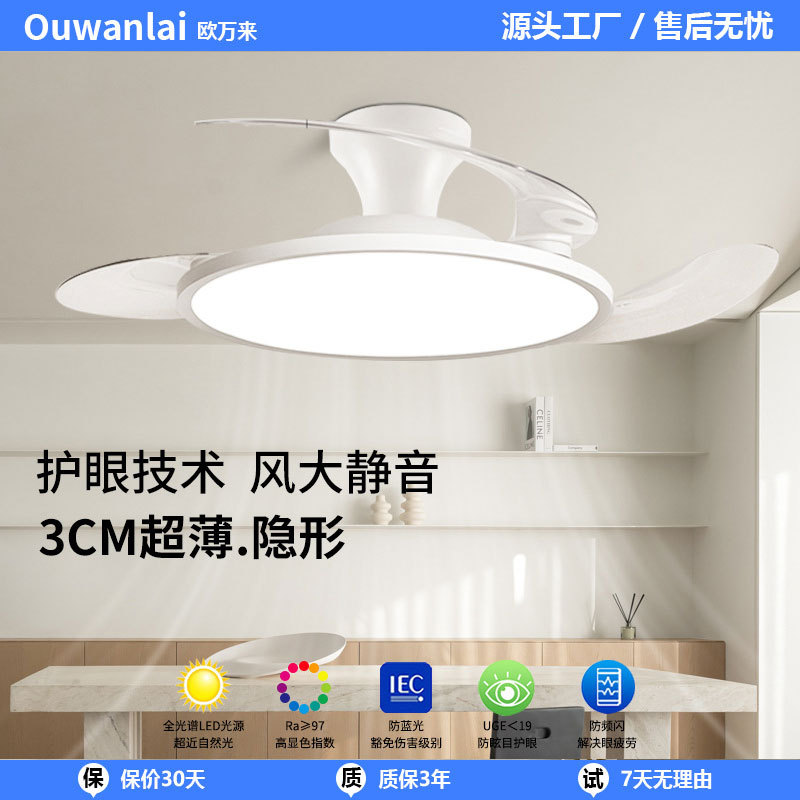 フルスペクトル目の保護風白ファンライトサイレントシンプルなレストラン寝室クリームスタイルホームスマート目に見えないシーリングファンライト