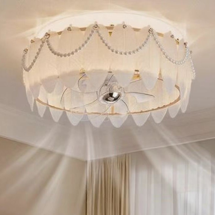 リビングルームの天井灯ファン付きクリーム風綿灯360度静音首振り寝室一体知能扇風機灯