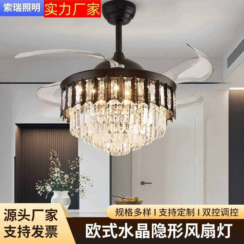 新型ヨーロッパ式水晶ファンライト客間寝室レストラン吊り扇ライト静音知能インバータ家庭用扇風機クロスボーダー