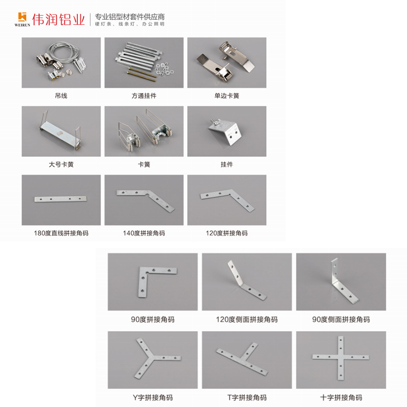 取り付け金具、プラグ、吊り下げ板、ステンレス製スプリングクリップ、大型7字型吊り下げワイヤー、伸縮式通し金具、各種接続金具、LEDライト