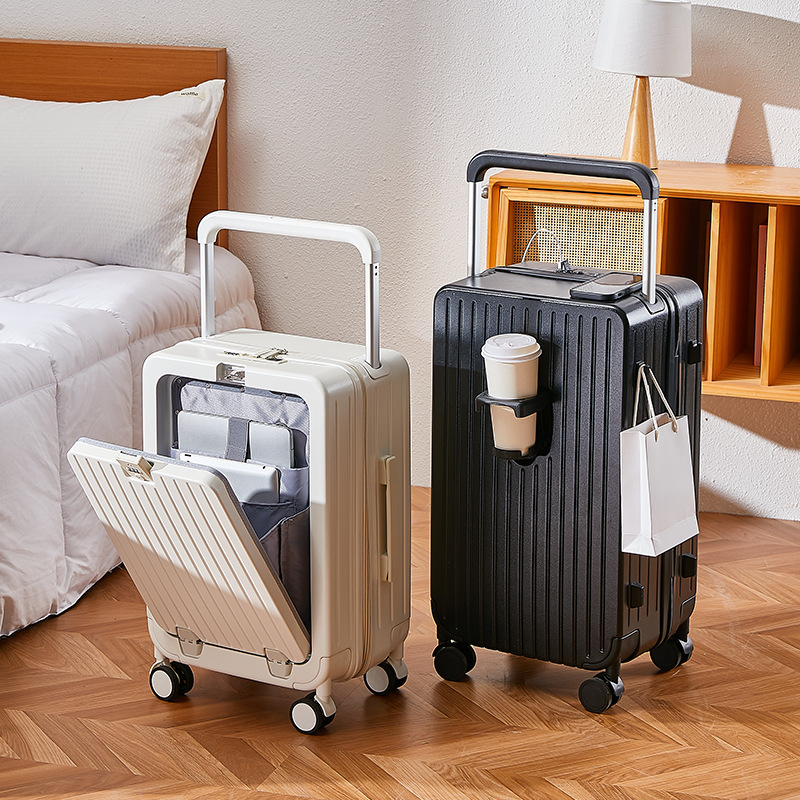 大容量フロントオープン式スーツケース 多目的カップホルダー付きトラベルケース パスワードロック付きメンズ機内持ち込みトロリーケース