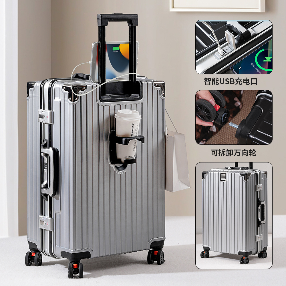 フロントオープン女性スーツケース男性アルミフレーム搭乗ケース20/24インチ旅行ケース携帯電話ホルダーusb充電スーツケース
