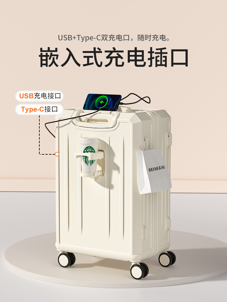 新しい充電式アルミフレームトロリーケース学生多機能スーツケース女性フックスーツケースカップホルダー男性パスワードボックス