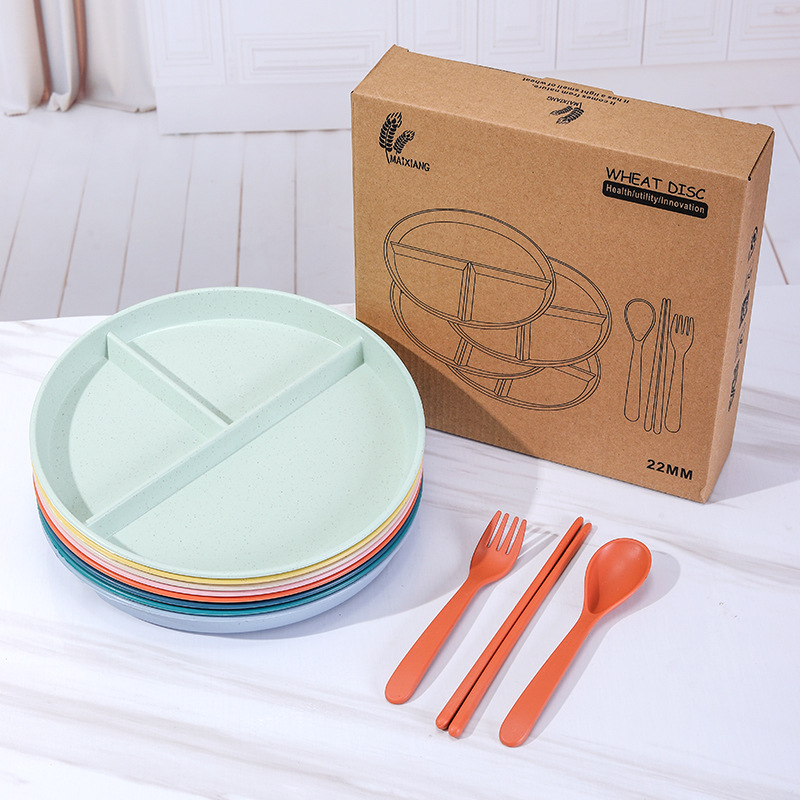 分格食事皿小麦わら減脂食事皿定量皿三格家庭用創意食器果物皿円形皿