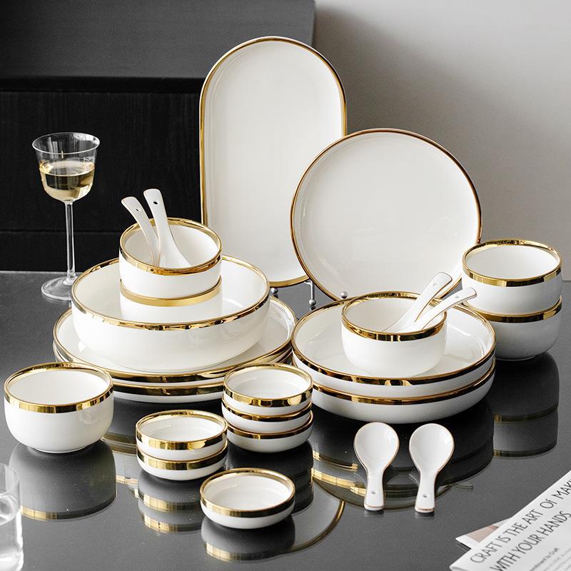 北欧の軽い贅沢な食事の皿の陶磁器のセットの金の辺の碗の皿のプラチナの家庭の碗の食器の皿のスープの碗のプレゼントの箱の中で