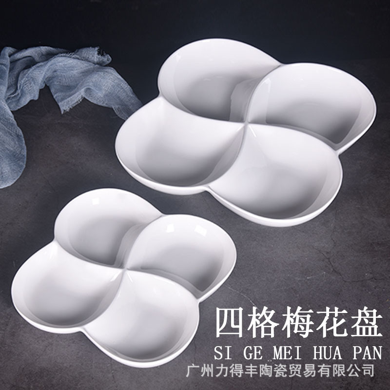 梅の花の四格の陶磁器の前菜の皿は厚い純白のホテルの食器の多格の果物の皿の冷たい盛り合わせをします。