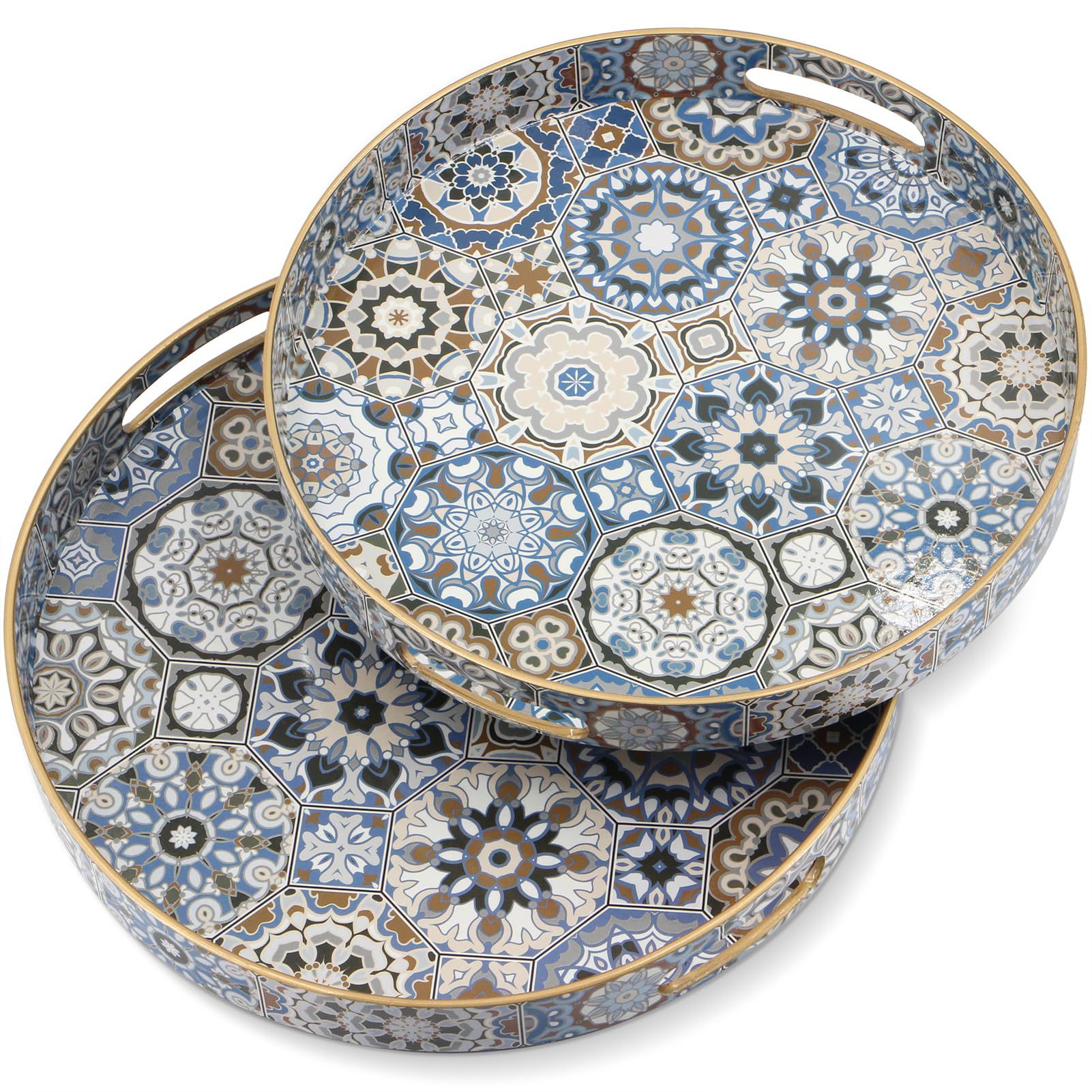 クロスボーダーラウンドPPプラスチックトレイボヘミアンスタイル模造タイルデカール紙ハンドル付きプラスチック装飾トレイ