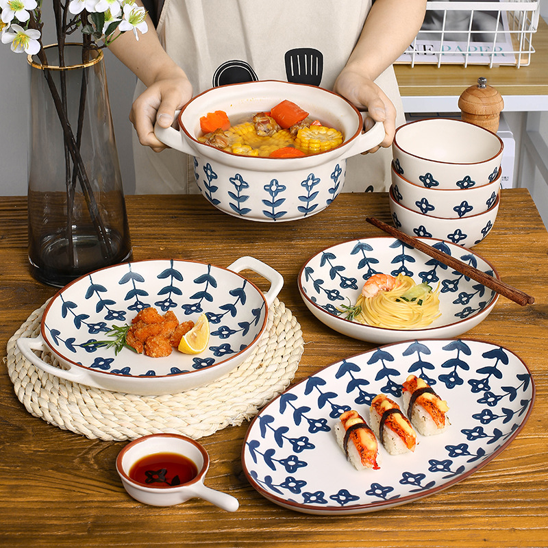 日韓風復古小藍花陶磁器食器茶碗料理皿スープ碗調味料皿家庭用レストランセット