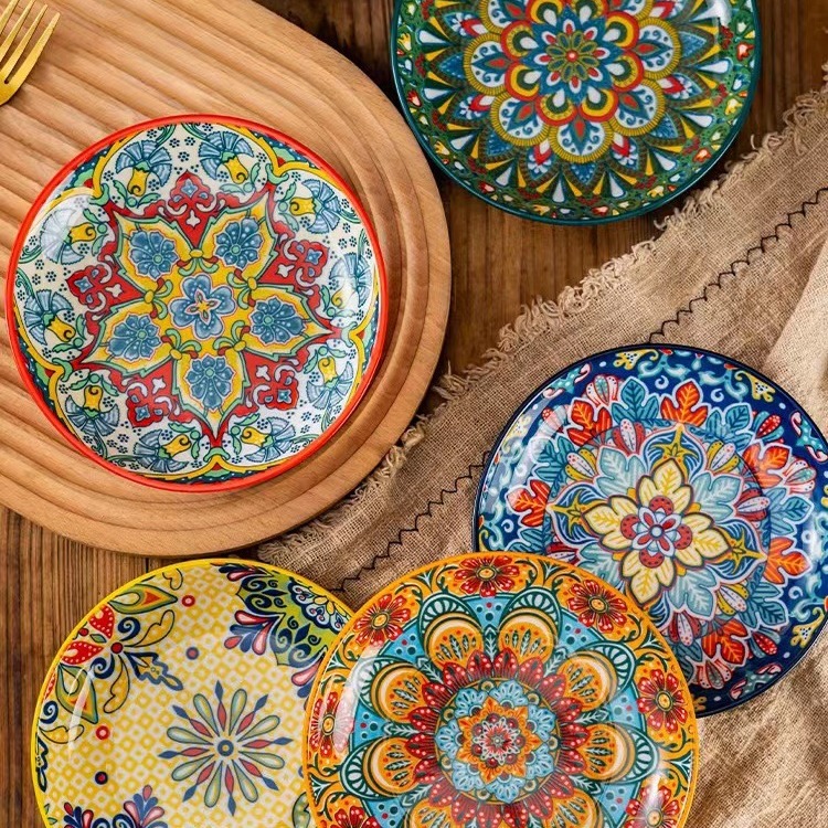 陶磁器の皿のボヘミアンの浅い皿の手描きの釉薬の下で色の果物の皿の冷たい料理の皿は骨の小さい皿のホテルの骨の皿を吐きます。