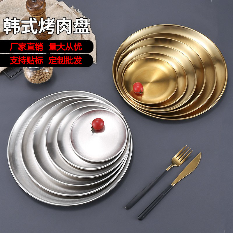 304ステンレス円盤韓国式焼肉皿金色トレーレトロ洋食皿焼き皿骨皿浅皿卸売り