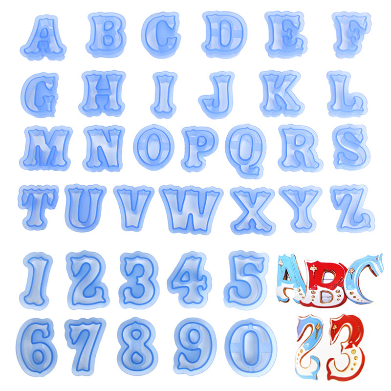 ビスケットのプリントの英語のアルファベットの数字は型を切って砂糖のケーキのチョコレートの型をひっくり返します。
