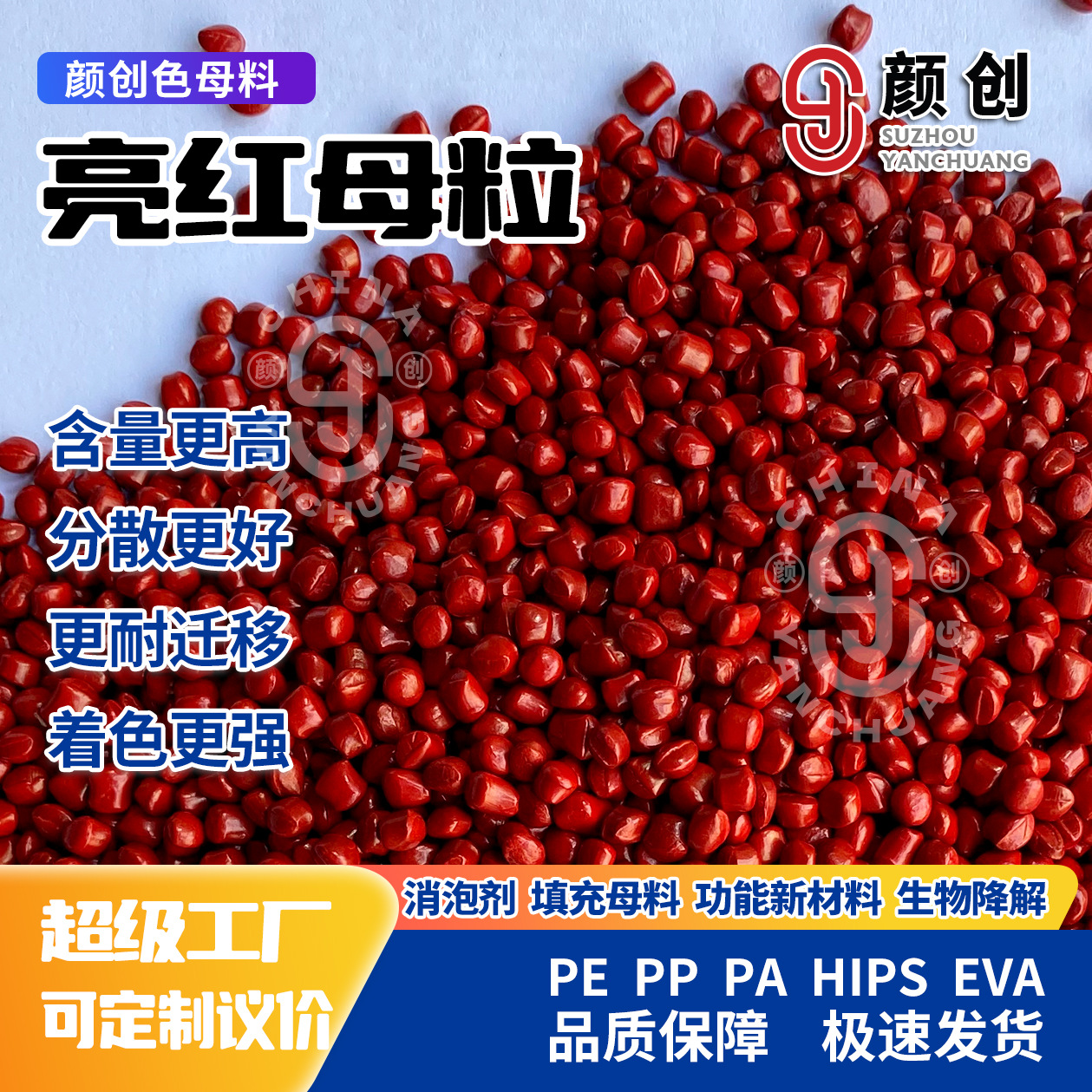 顔創PE高濃特亮紅色母粒高温吹膜級はベストバッグ馬挟み袋紅母材に適している