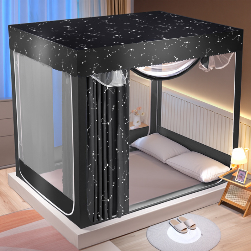 新型全遮光学生はベッドに座って遮光ファスナー蚊帳を描きます。