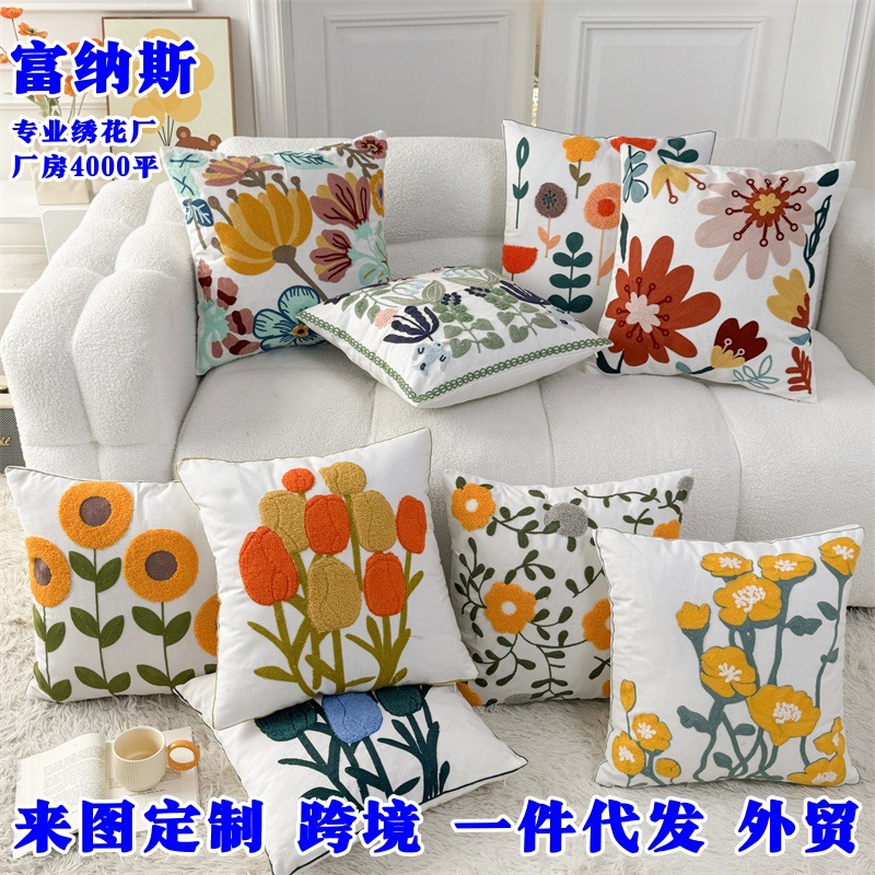 国境を越えたカスタムメイドのインスタ映えする花柄刺繍枕カバー、ソファカバー、背もたれ、ベッドサイドクッション、枕、キャンバス、タオル刺繍