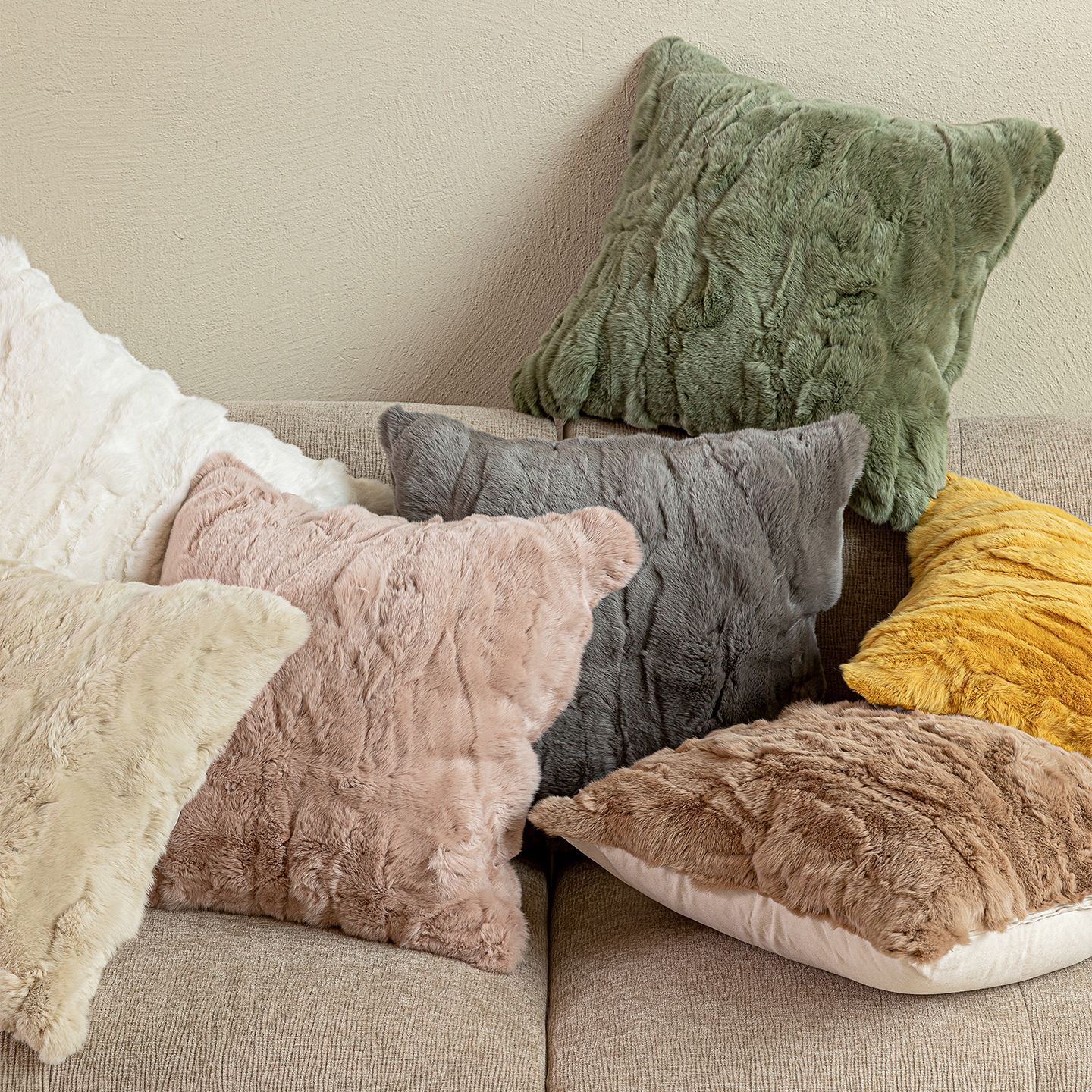 猫の手触りは現代的で贅沢な風の客間のソファーのウサギの毛が枕の寝室の窓を抱いて枕の灰色の緑色のピンクに寄りかかっています。