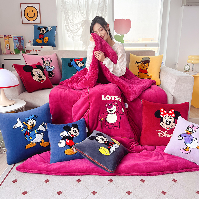 正規版ディズニー抱き枕布団両用二合一厚手保温冬いちご熊ミッキー枕毛布