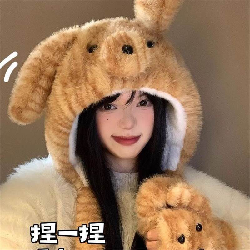 虎紋の子犬の耳は毛の帽子の女性の冬のかわいい漫画を動かします。