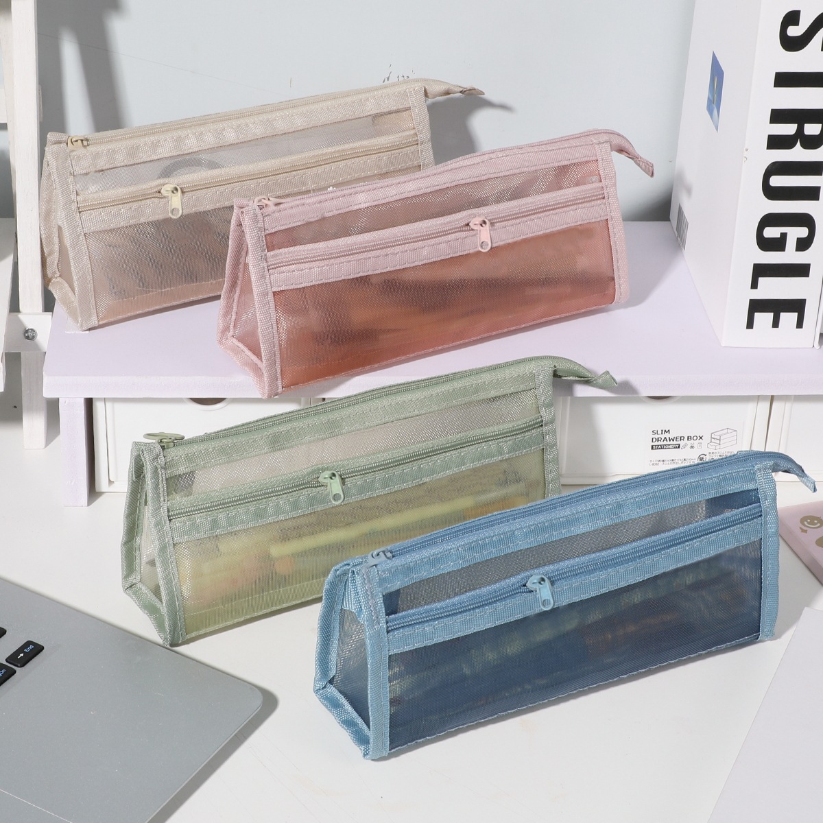 透明網紗筆袋二重立体大容量中学生試験文房具袋シンプル純色収納袋卸売り