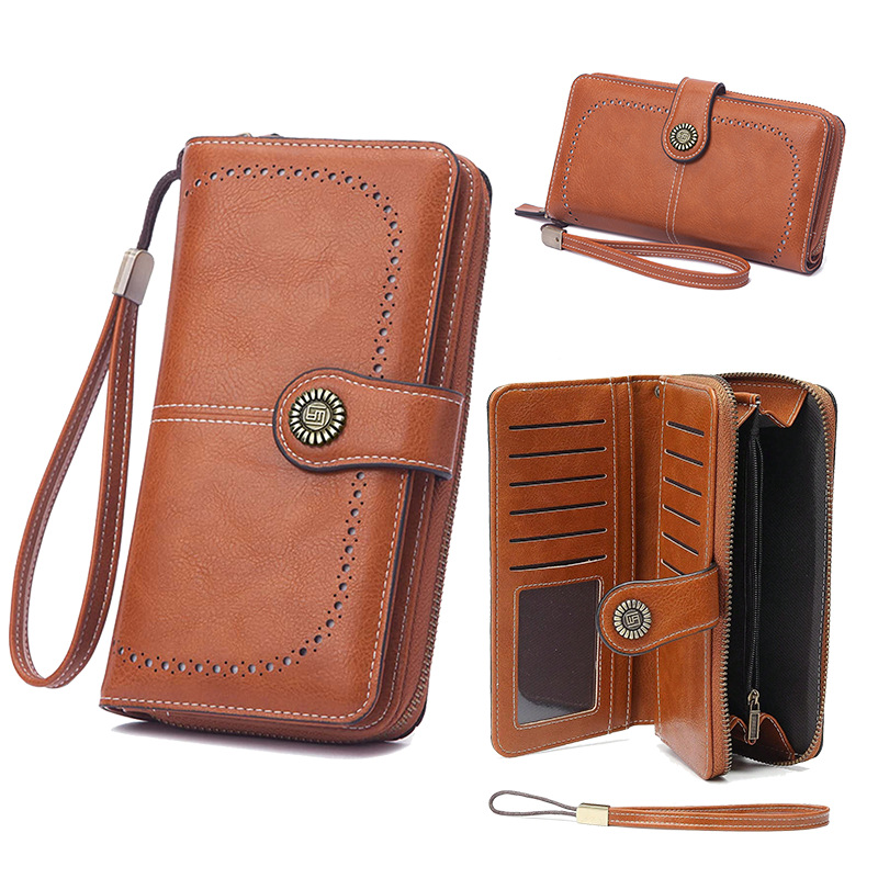 クロスボーダーの新型女性の模造のワックスの皮のハンドバッグの男性の多カードの位の長いファスナーの財布のファッション的な本革の小銭入れ