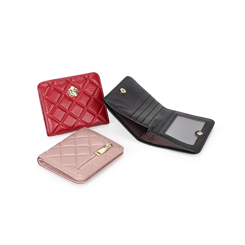 Wallet本革ショート財布女性羊皮二つ折り財布新型縦型菱格ファスナー小銭入れ