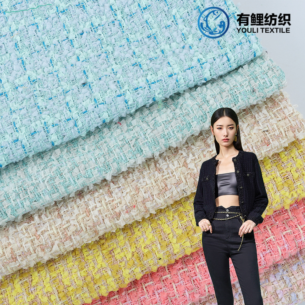 布野の新型春秋小香風の布地の明るいシルクの格子の粗い花の布地は婦人服の子供服の服装の布地を編みます。