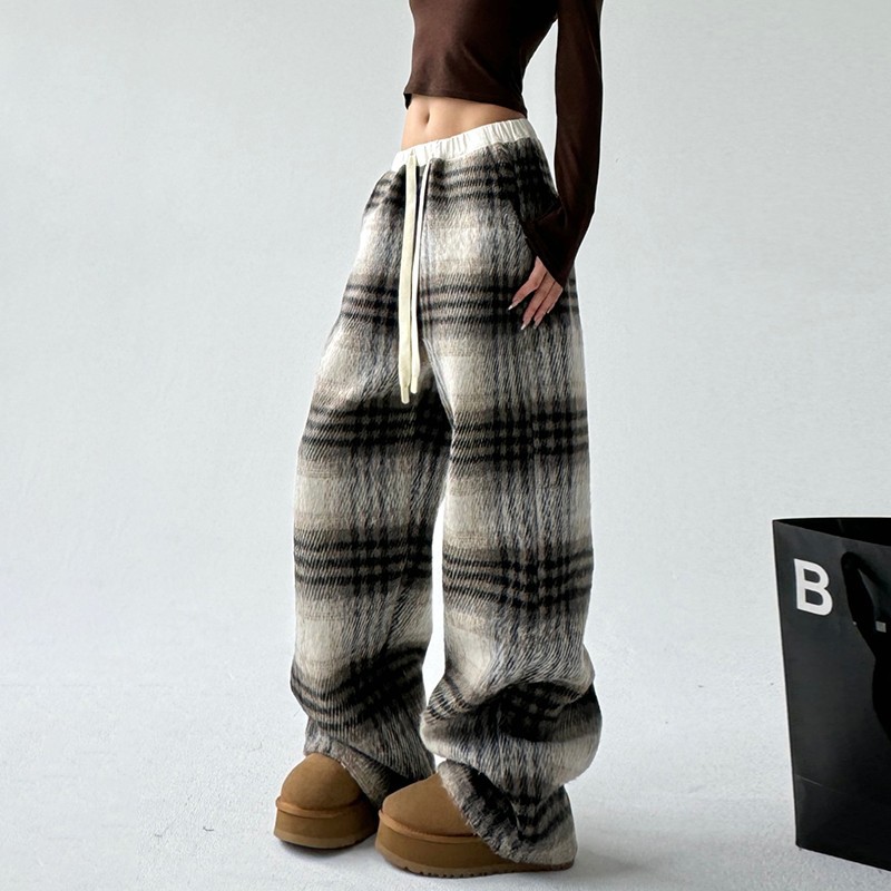 毛の格子縞のズボンの女性の秋冬のベルベットの2024の新型のまっすぐな筒のカジュアルな腰のゆったりしている厚い怠惰なズボン